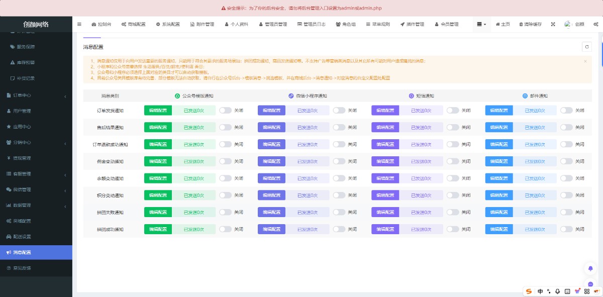 支持微信公众号配置,自定义菜单自动回复、公众号通知配置等;