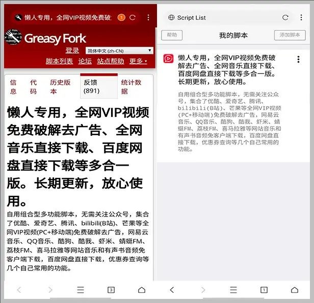 X浏览器for Android用户可以直接访问油猴脚本网站,下载并使用各类脚本,包括解锁视频网站VIP内容的脚本,实现在线解析VIP视频。脚本官网提供了丰富的资源:Greasy Fork.